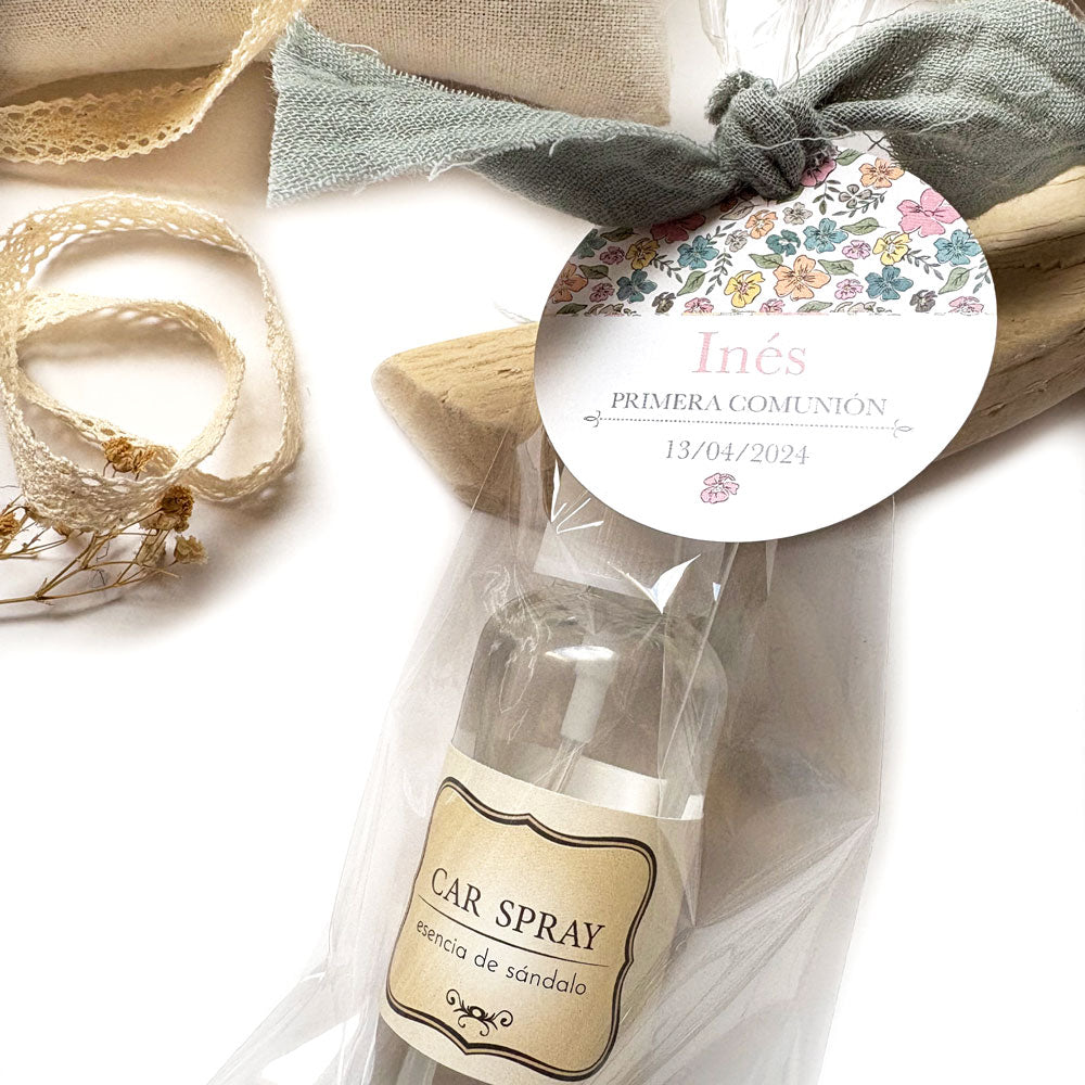El car spray viene presentado dentro de una bolsita de celofán con cinta de doble gasa de un tono acorde a los del diseño elegido para la etiqueta que también va incluida.