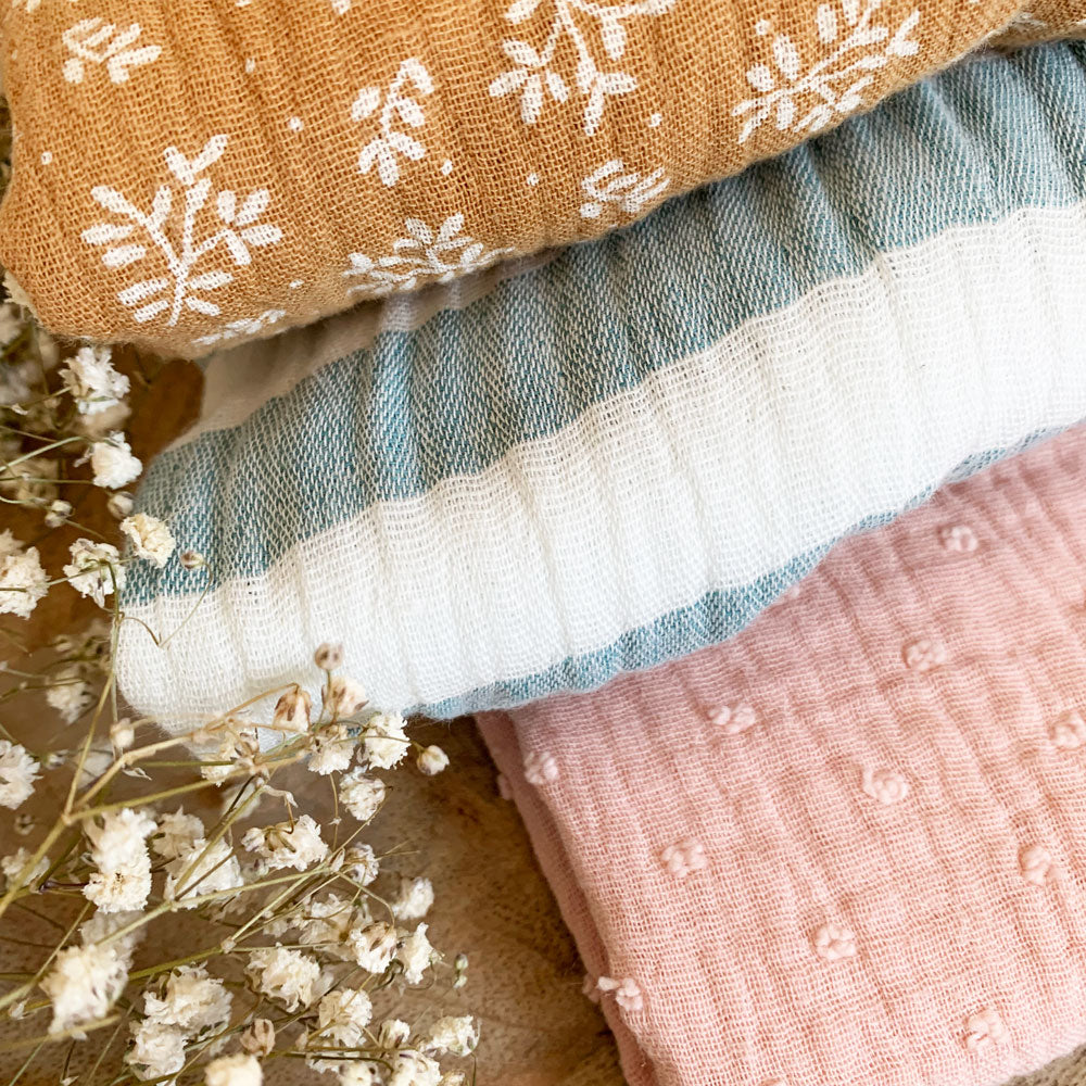 Actualmente tenemos disponibilidad de tela en muselina leaves mostaza, rayas anchas verdes, rosa palo plumeti.