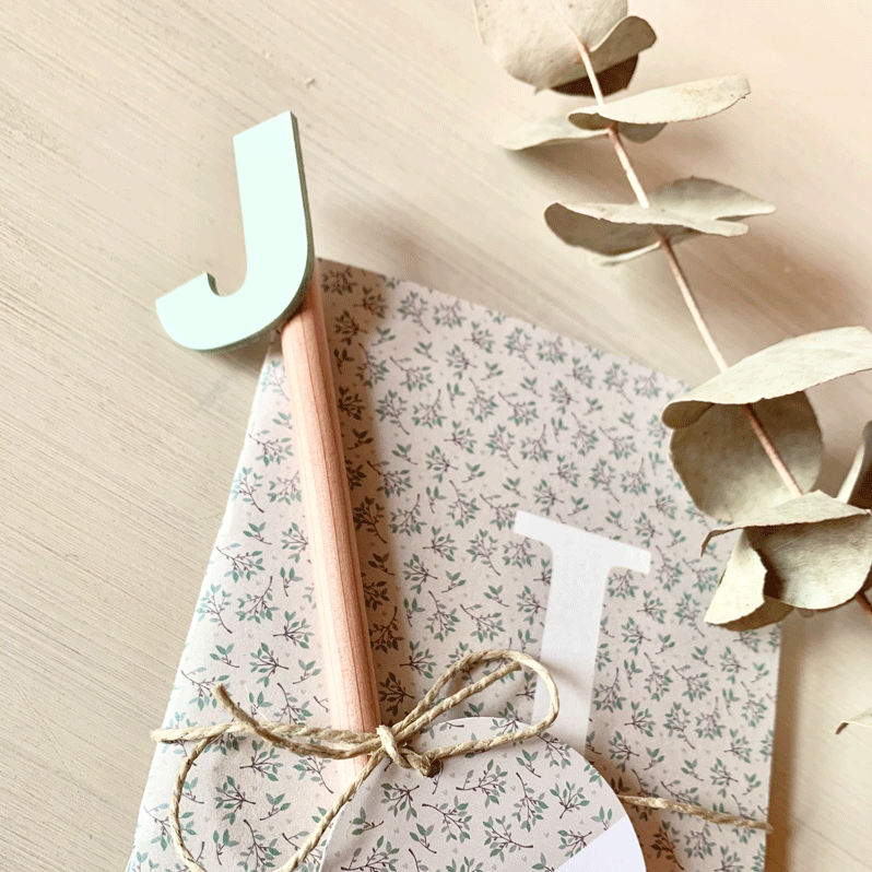Caja regalo compuesta por una libreta tamaño A5 personalizada con inicial o nombre según el diseño, o el dibujo de la niña de comunión, una libreta tamaño A6, un lápiz con inicial en madera, llavero, coletero y estuche personalizado.
