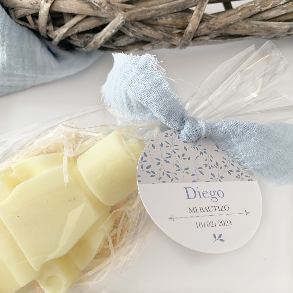 Jabón con forma de figura de lego para tus invitados, acompañado de una bolsita de celofán con virutas de madera, lazo de doble gasa y etiqueta de la colección personalizada.
