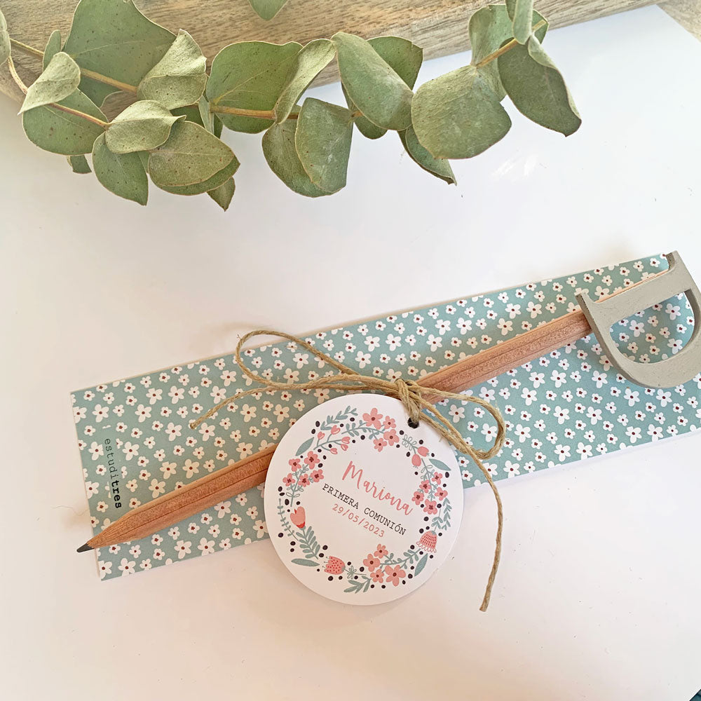 Lápices de madera de cedro con inicial de madera pintada a mano acompañados de un packaging compuesto por cartulina estampada a escoger entre varios estampados y etiqueta personalizada con el nombre y el diseño de la colección.