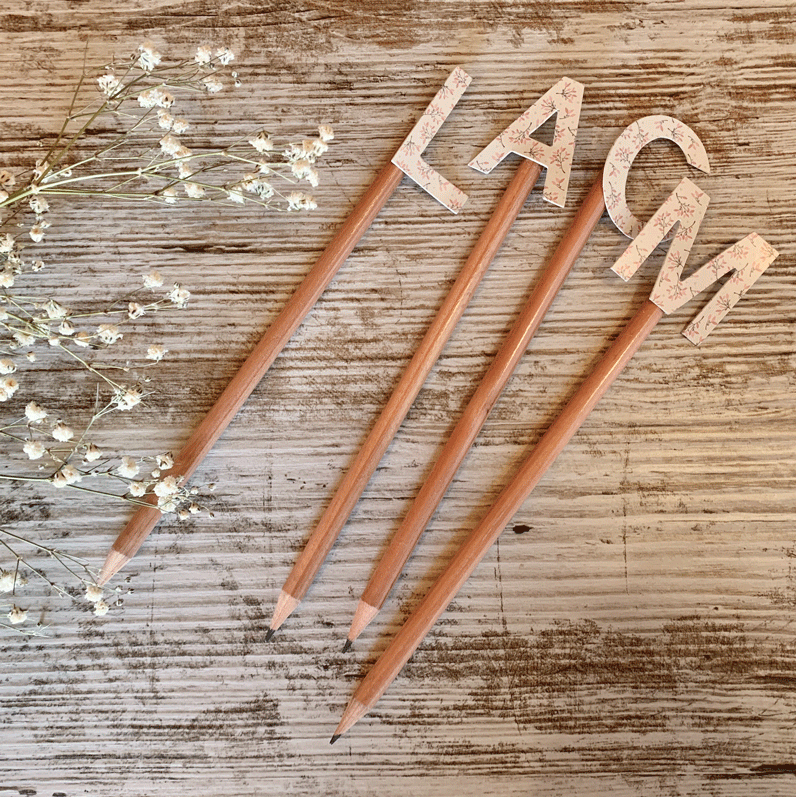 Regala un precioso lápiz con la inicial de cada invitado y personaliza la etiqueta.