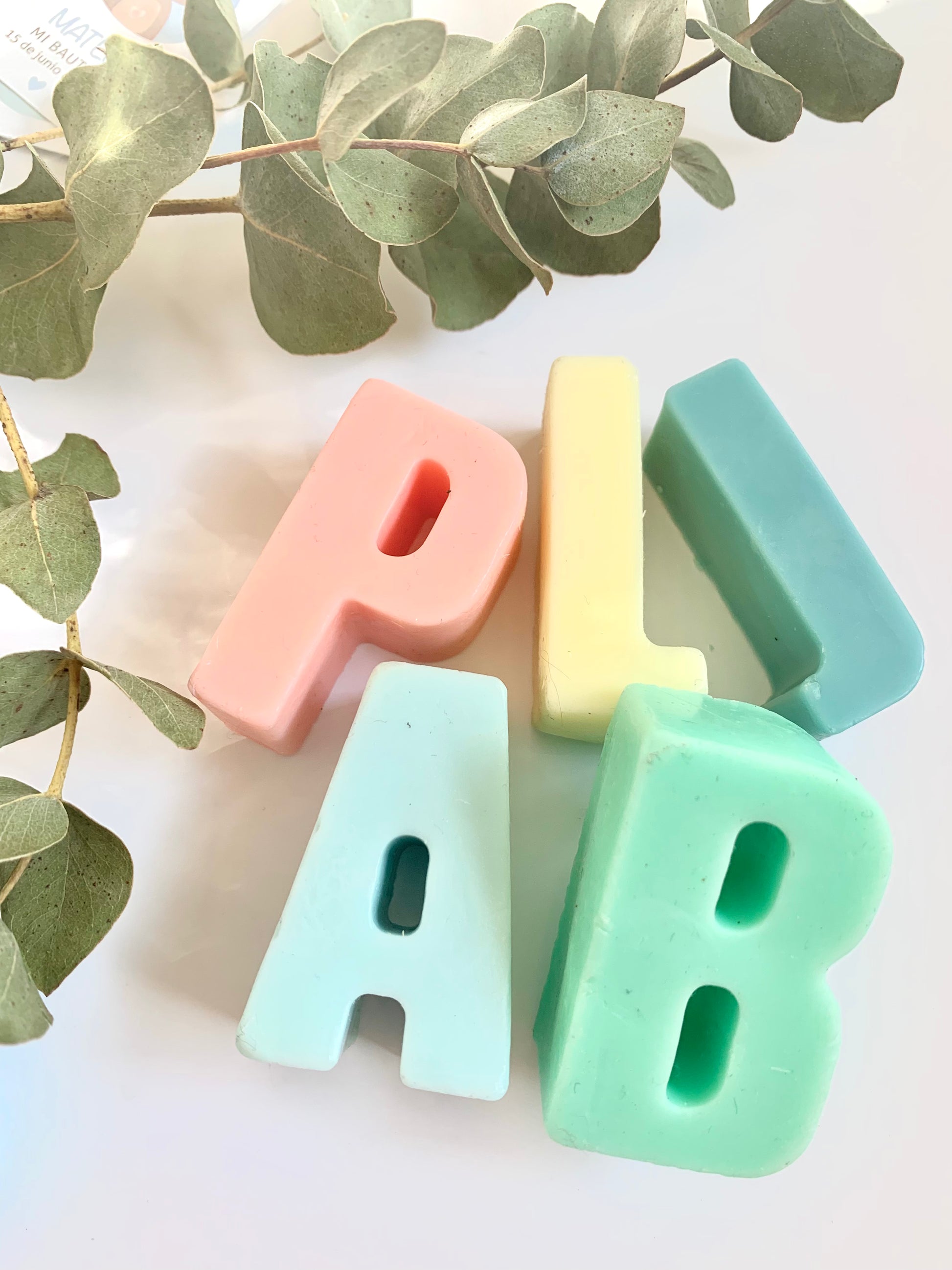 Detalle de jabón natural aromático con forma de letra y con un packaging personalizado ideal.