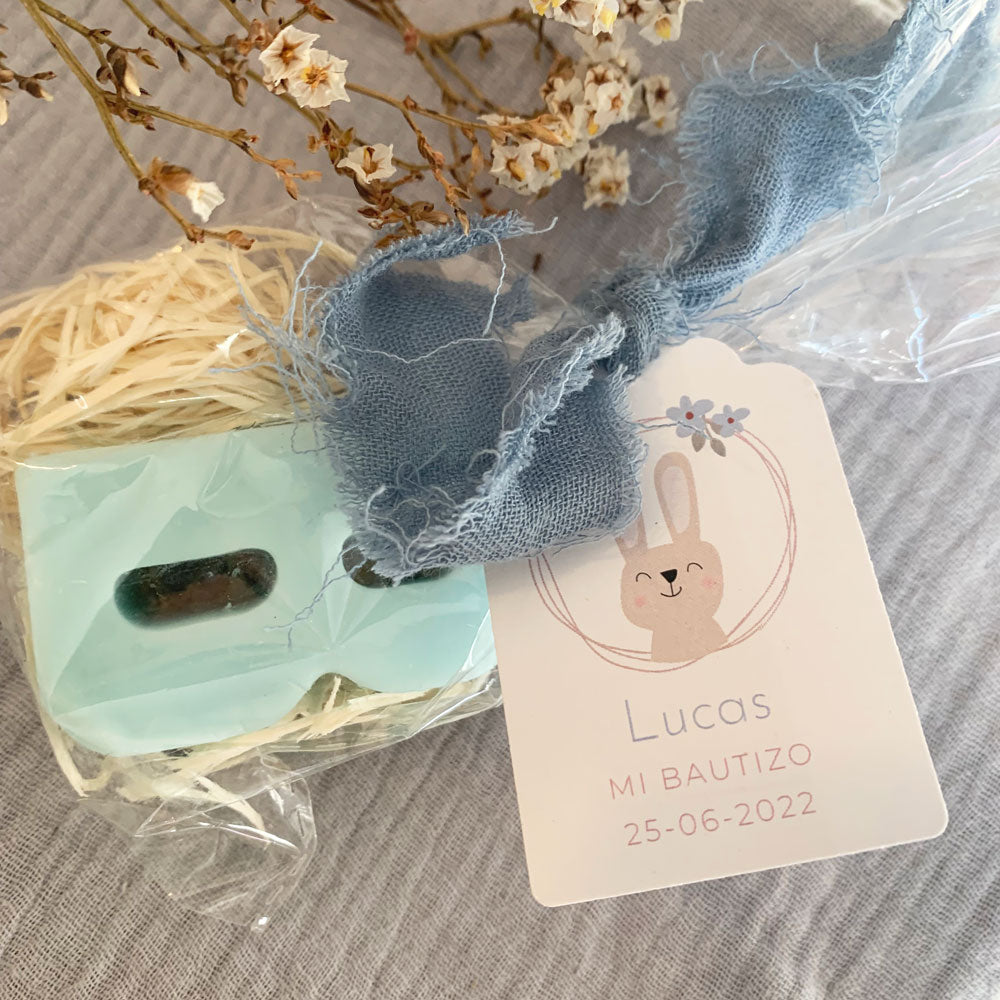 Los jabones vienen presentados en papel de rafia y dentro de una bolsita de celofán con etiqueta personalizada y cinta de tela de gasa a juego. Se puede cambiar la opción de cinta a un estampado vichy bajo pedido.