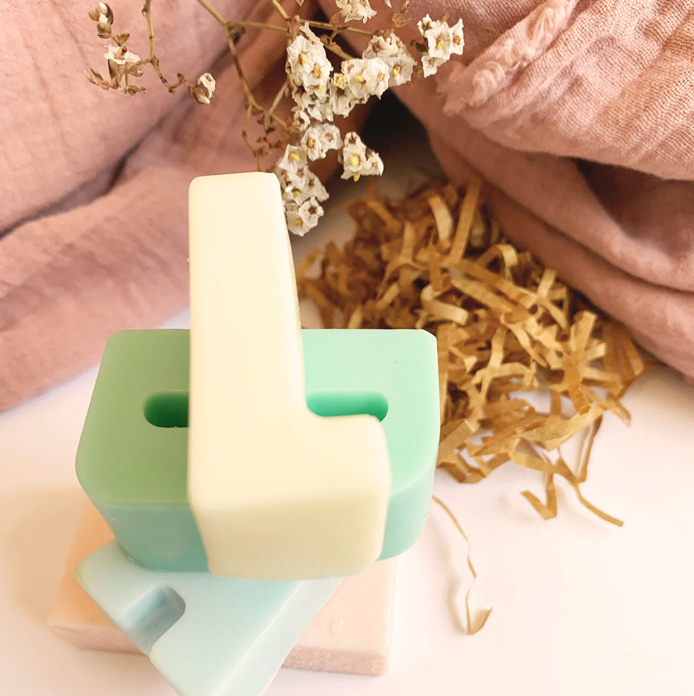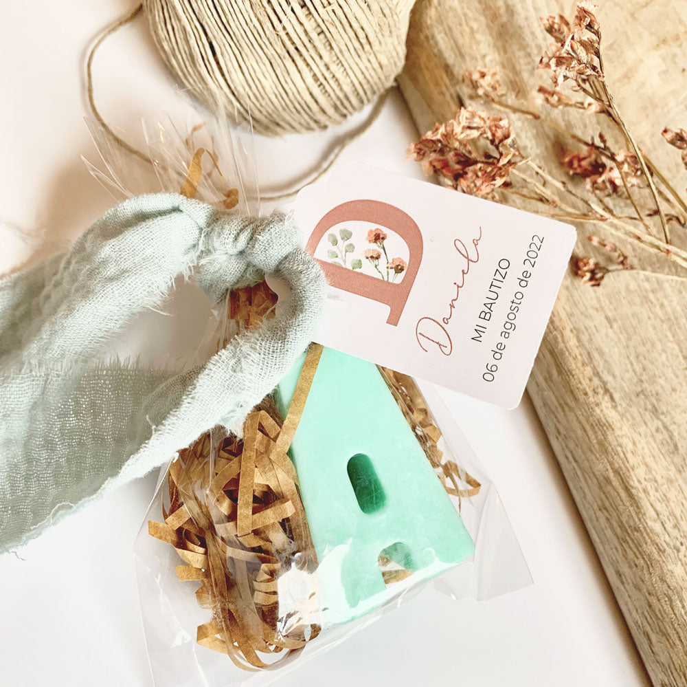 Detalle de jabón natural aromático con forma de letra y con un packaging personalizado ideal.