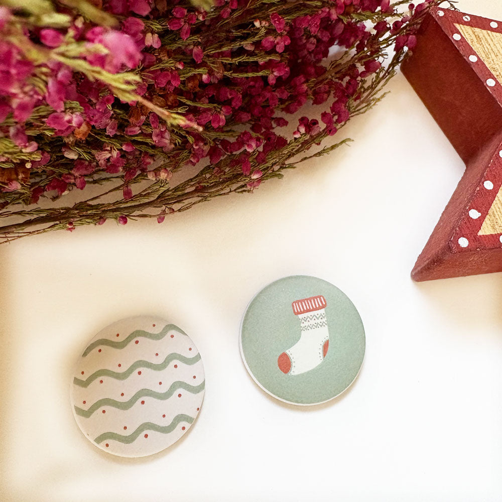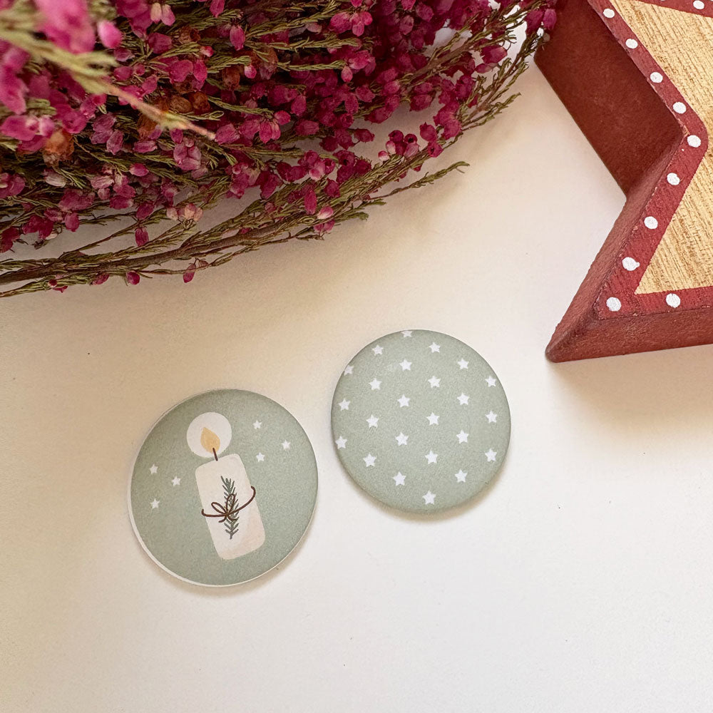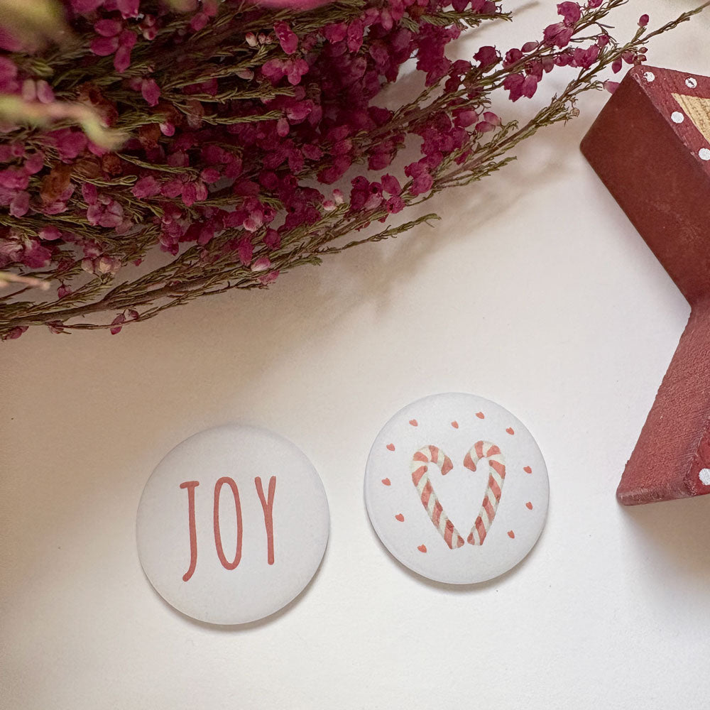 Cada pack incluye dos mini imanes de 31 mm de la colección floral que elijas más un tarjetón personalizado con la inicial, nombre y fecha.