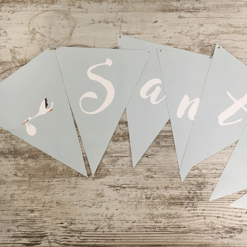 Cada guirnalda incluye de 5 a 8 banderines dependiendo del nombre a personalizar. La guirnalda contiene dos banderines iguales con el diseño de la cigüeña y en el resto van las letras del nombre del niño/a.