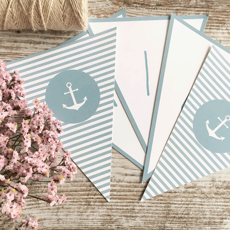 Cada guirnalda incluye de 5 a 8 banderines dependiendo del nombre a personalizar. La guirnalda contiene dos banderines iguales con el diseño marinero y en el resto van las letras del nombre del niño/a.