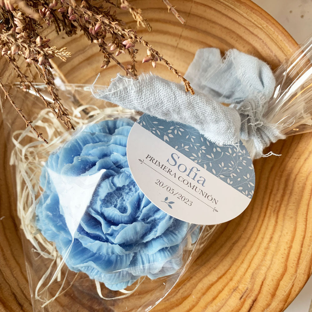 El jabón irá dentro de una bolsita de celofán, una cinta de doble gasa y la etiqueta de la colección inicial floral con el estampado y forma que elijas.