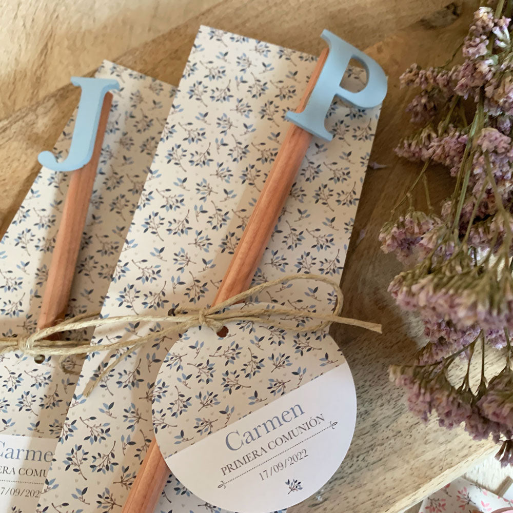 Un detalle personalizado para cada invitado. Lápices con inicial en madera pintada a mano.