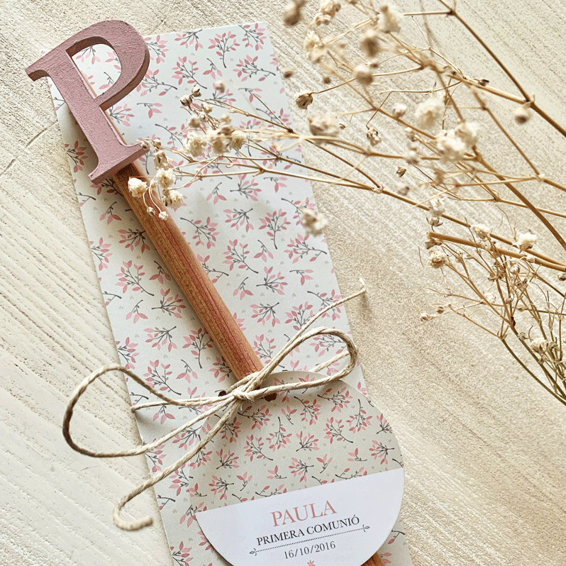 El lápiz viene presentado con una base estampada floral y la etiqueta a juego dentro de una bolsita de celofán.