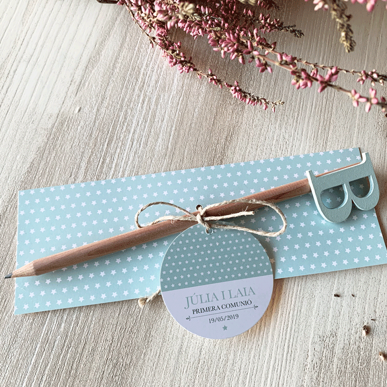 El lápiz viene presentado con una base estampada y la etiqueta a juego. Puedes elegir entre la etiqueta redonda o la alargada con inicial.