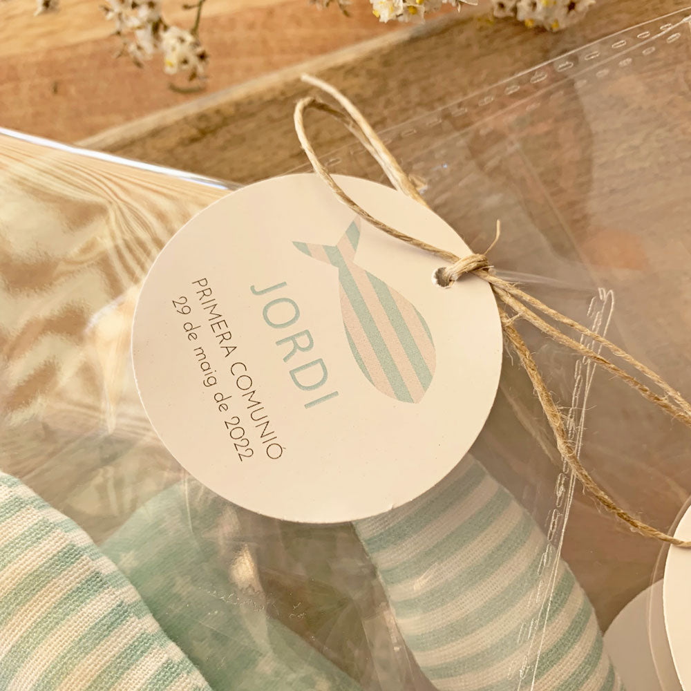 Vienen presentados con una bolsita de celofán y una etiqueta redonda o alargada con los datos del niño o niña y la fecha de la celebración.