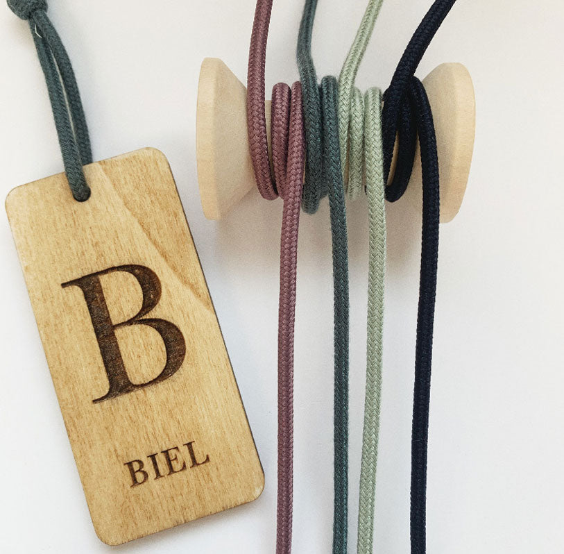 Acabados del llavero: pueden ir barnizados en roble oscuro o roble claro y elegir entre cinta elástica con brillo o cuerda mate en varios tonos.