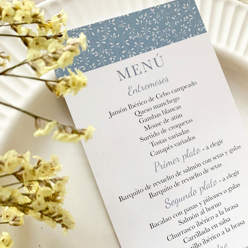 Para efectuar la compra sólo tienes que escribirme en el apartado instrucciones para el vendedor la colección, color o estampado para poder diseñar el producto acorde al diseño del evento. Una vez hecha la compra mandar un mail con el número de pedido con el menú para poder diseñar la minuta.