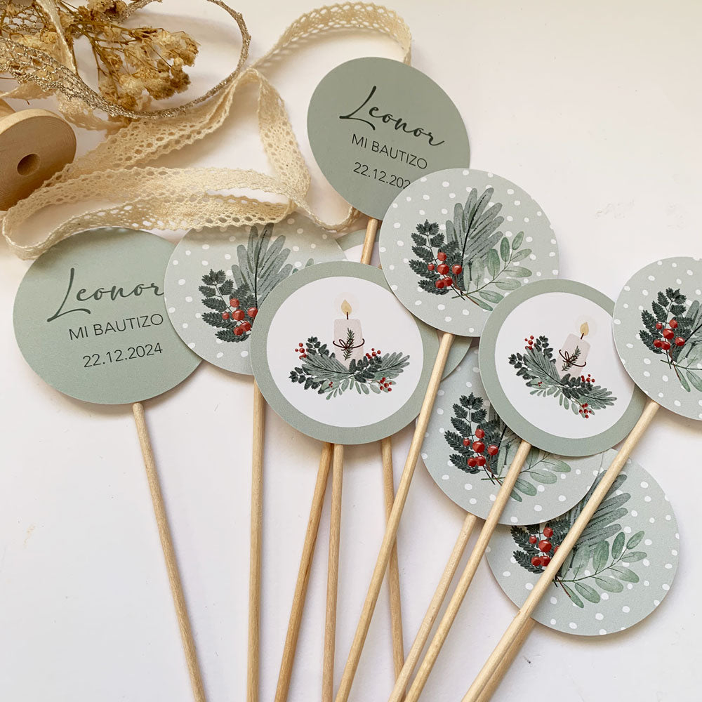 También tienes opción de no poner nombre y entonces te llegarán 6 toppers con la ilustración de la velita y 6 toppers con la ilustración de las hojas navideñas.