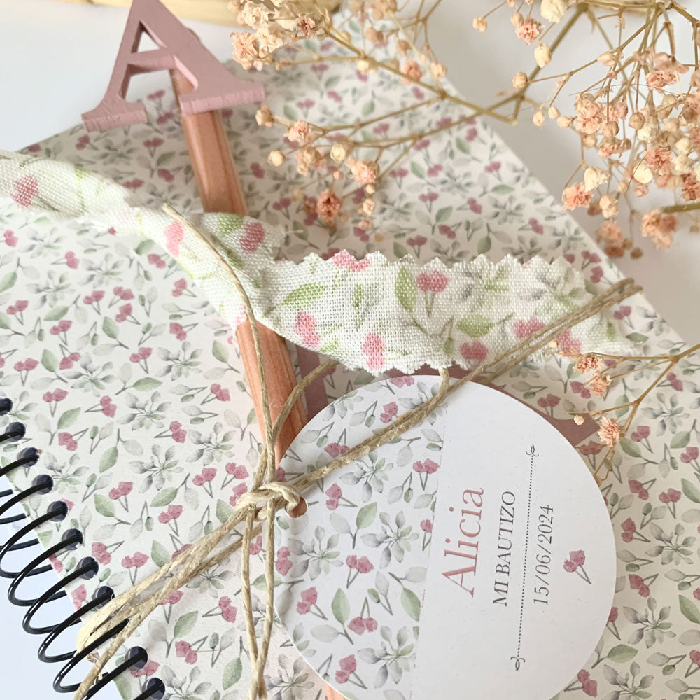 Puedes añadir un lazo de tela con el floral de la libreta o inicial.