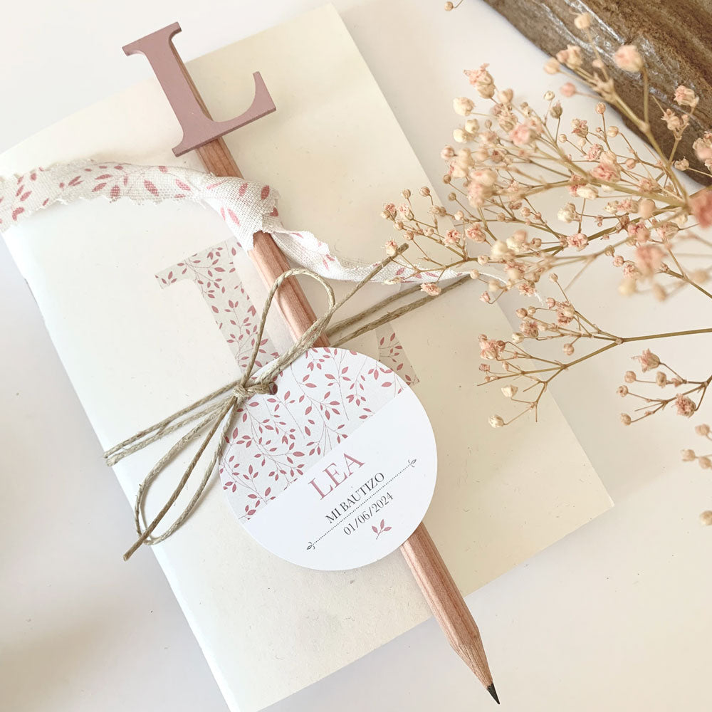 La libreta viene presentada con el lápiz atado con cordel natural y una etiqueta personalizada dentro de una bolsa de celofán.