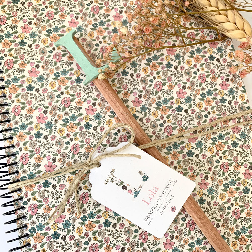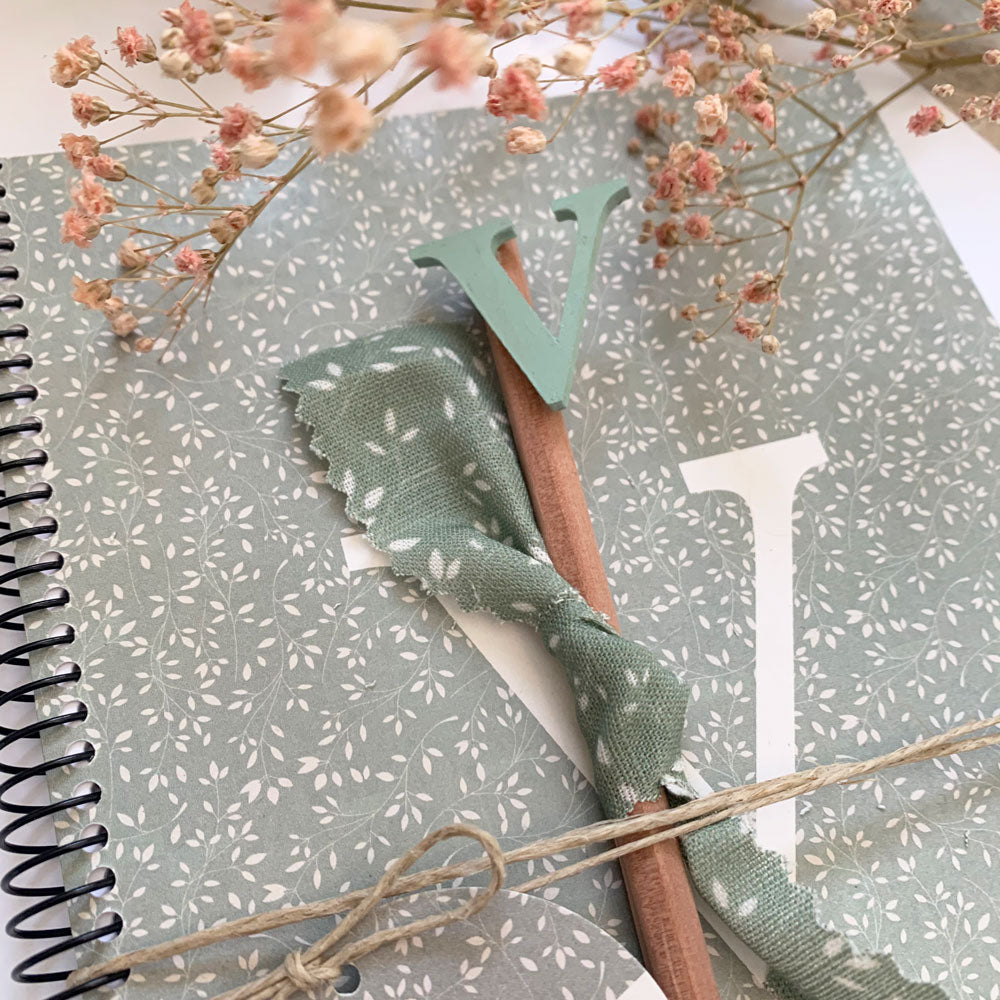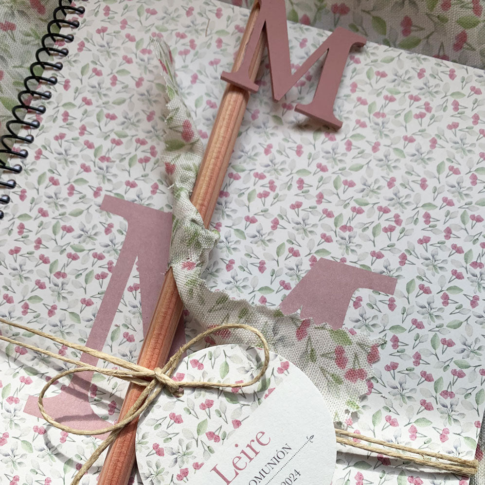 Puedes añadir un lazo de tela con el floral de la libreta o inicial.