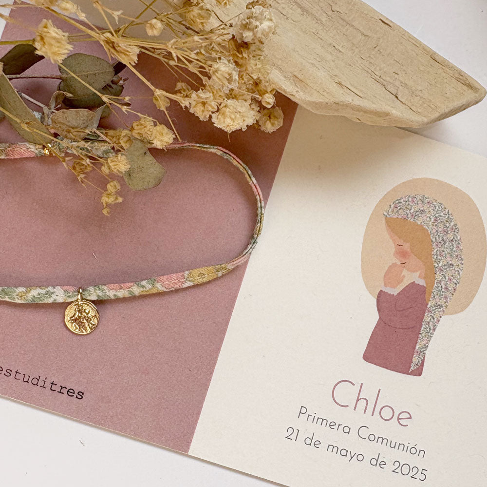 Todas las pulseras van acompañadas de un tarjetón con la ilustración de la virgencita con el manto estampado igual a la cinta elegida para la pulsera y los datos del evento a modo de recordatorio.