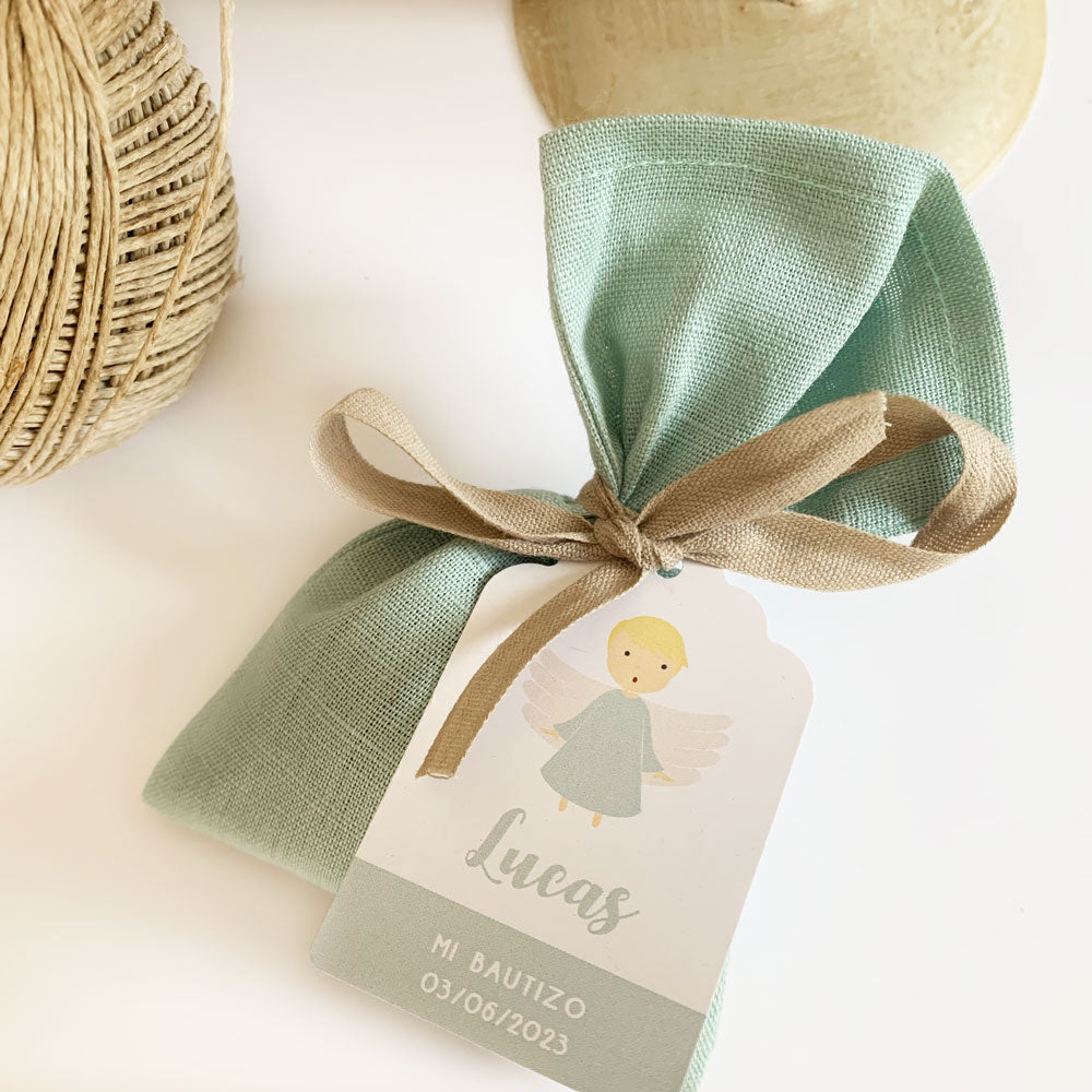 bolsita de lino rellena de semillas de lavanda y con etiqueta personalizada de la colección ángel niño,
