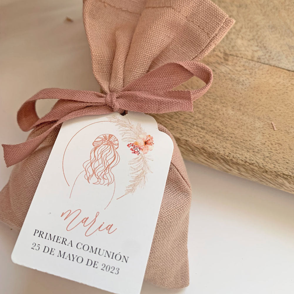 bolsita de lino rellena de semillas de lavanda y con etiqueta personalizada de la colección niña pampa.