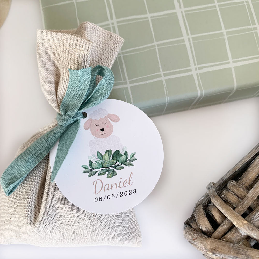 bolsita de lino rellena de semillas de lavanda y con etiqueta personalizada de la colección sweet lamb en forma circular o alargada.