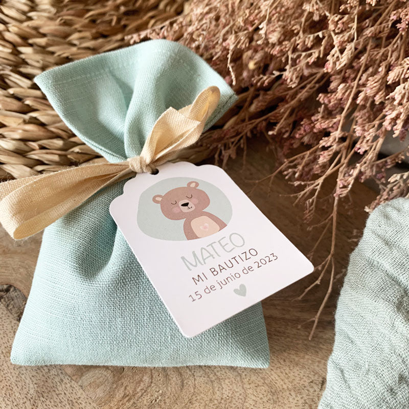 bolsita de lino rellena de semillas de lavanda y con etiqueta personalizada de la colección teddy.