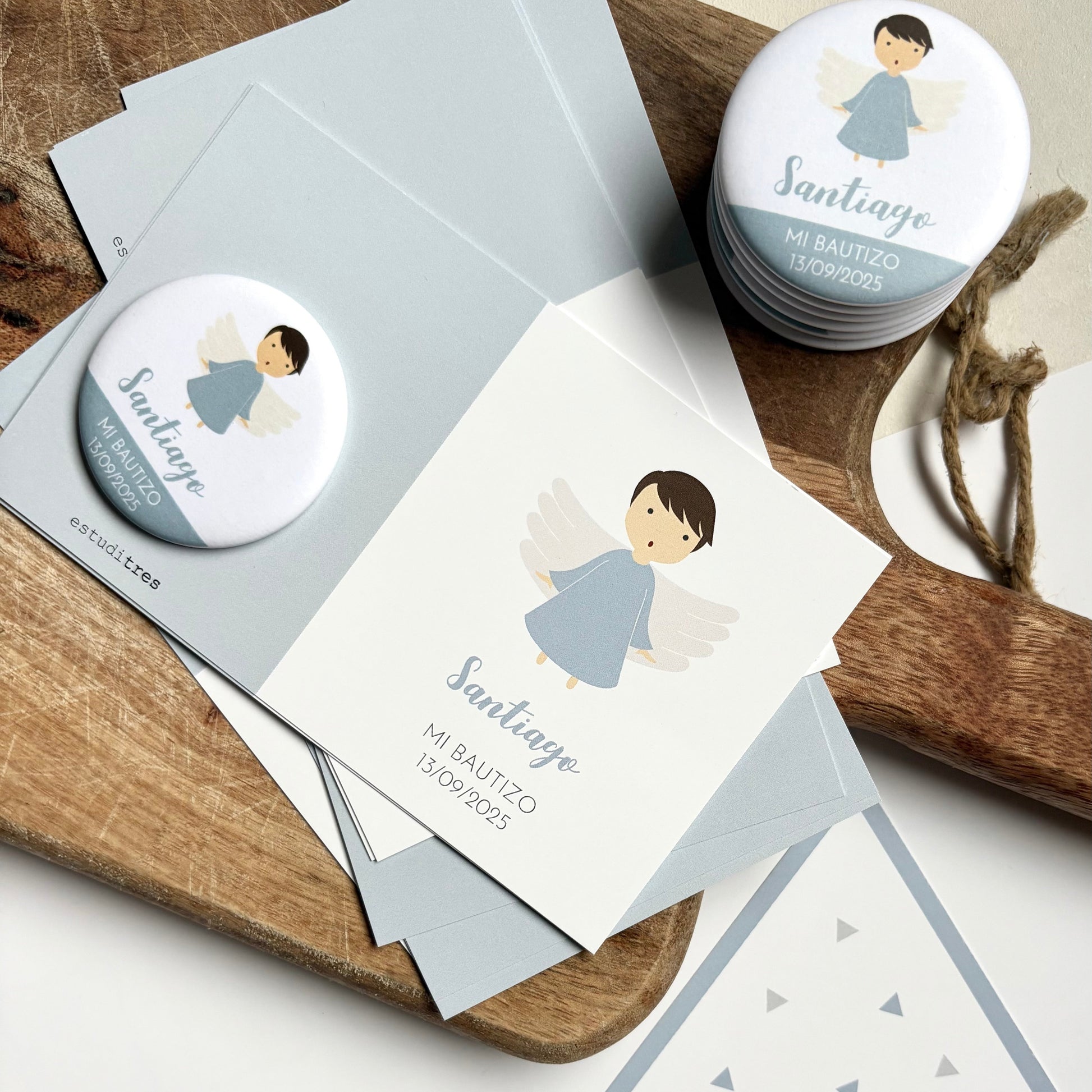 Imán de 56 mm con el diseño del ángel niño, el nombre y la fecha de la celebración.