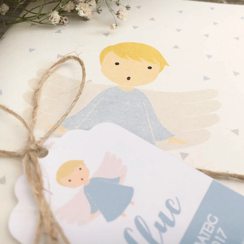 Libreta con el diseño del ángel niño en la portada, tamaño A6 ( 10 x 15 cm) y con la etiqueta a conjunto atada con cordel natural.