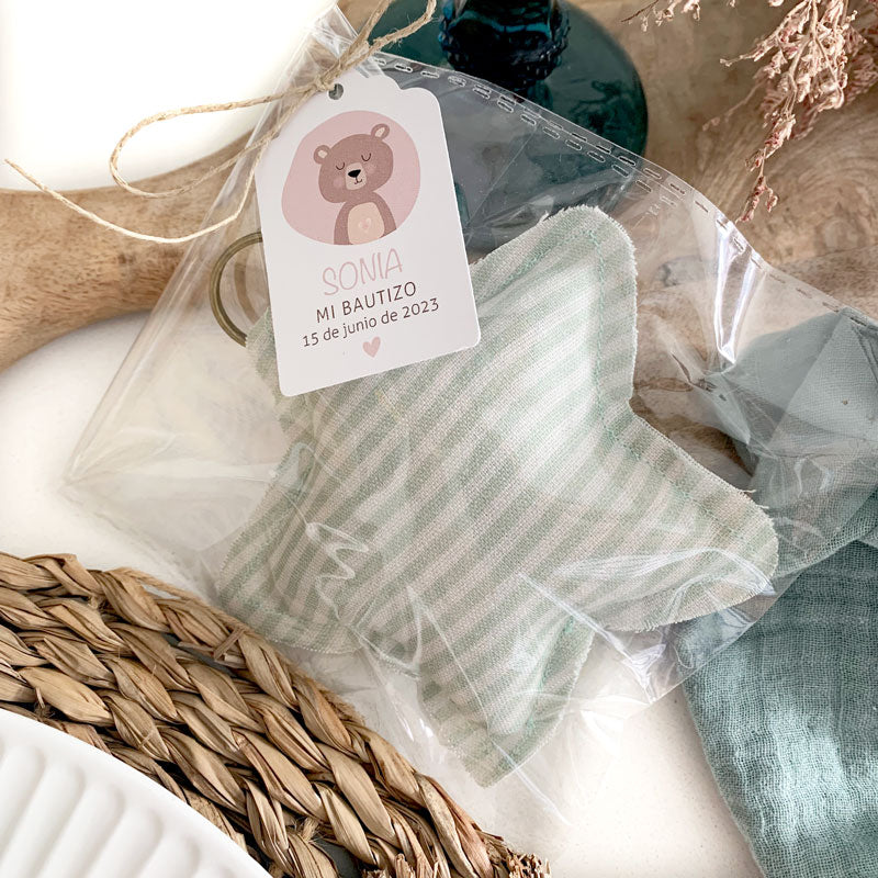 Todos los llaveros se entregan dentro de una bolsita de celofán y con la etiqueta del osito que puede ser en azul, rosa o verde.