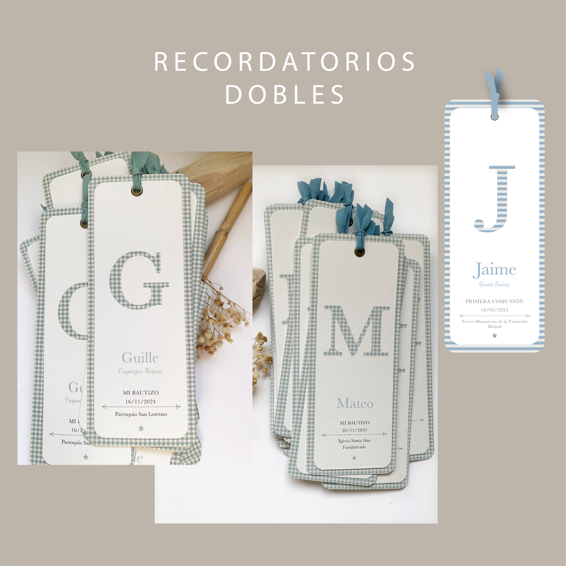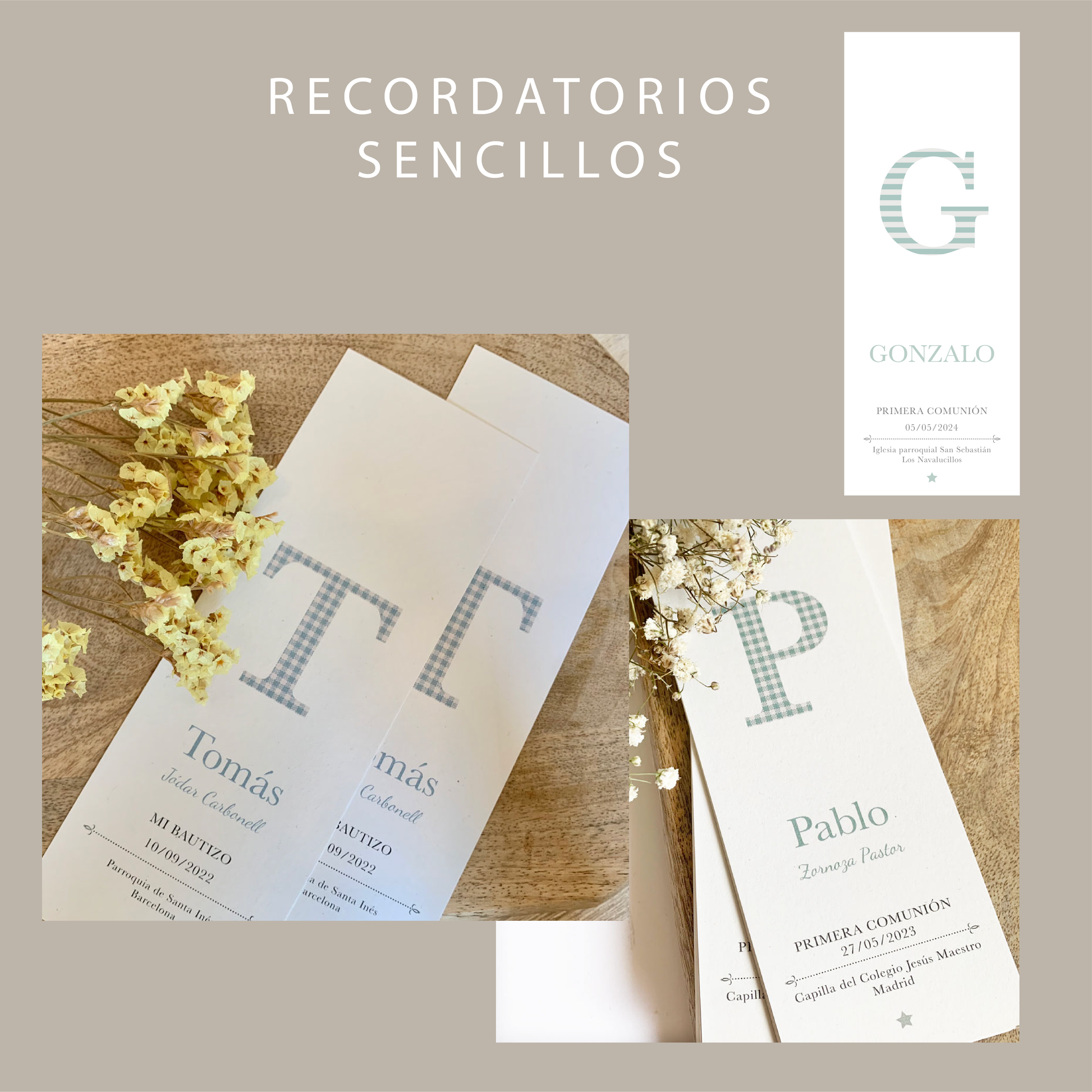 sencillos : una cartulina impresa a una cara. medidas 17x 6 cm. Los recordatorios sencillos no llevan cinta.