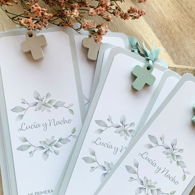 dobles con cruz: dos cartulinas unidas por una cinta de algodón acorde con el color elegido acompañadas de una cruz de madera pintada a mano.
