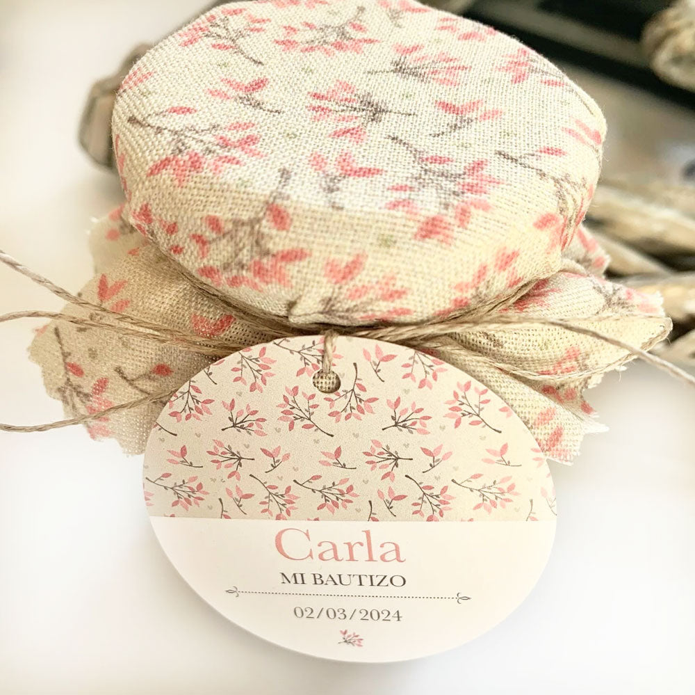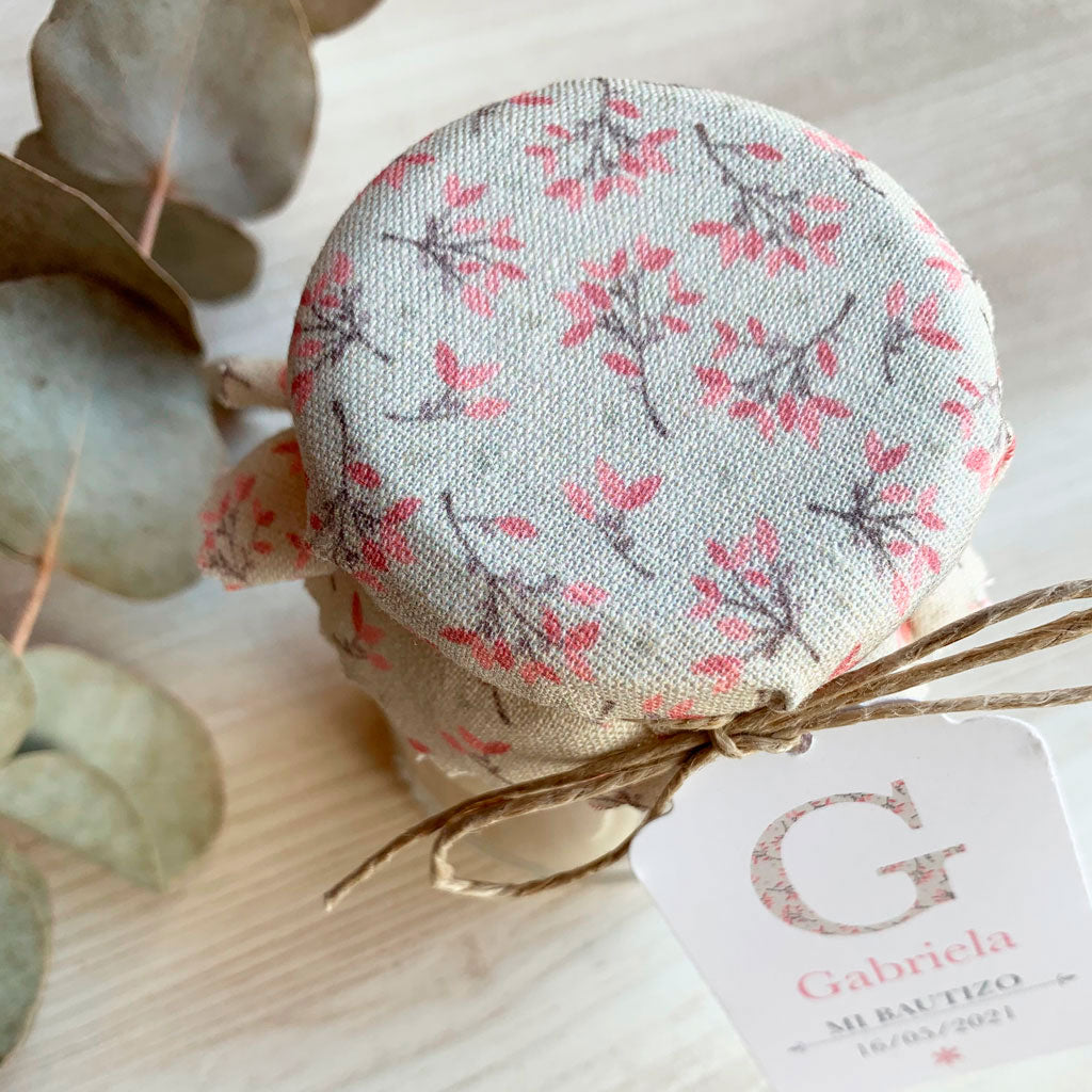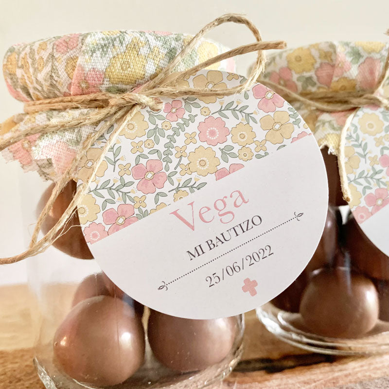 Recordatorio bautizo tarro dulce inicial floral