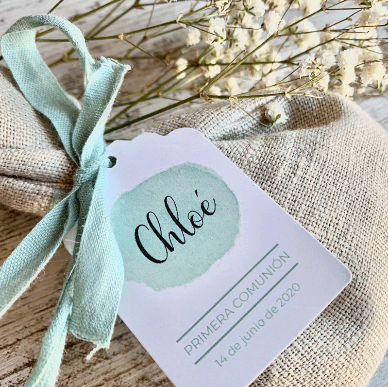 Puedes escoger el color de la bolsita entre 5 tonos y la cinta de algodón de la bolsita.