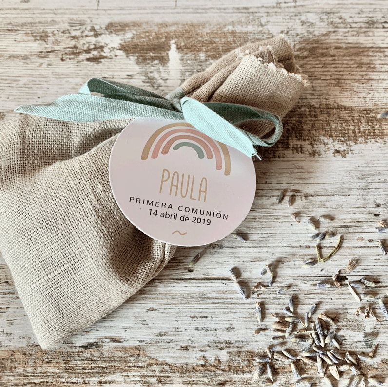 Bolsita de lino rellena de semillas de lavanda y con etiqueta personalizada de la colección rainbow.