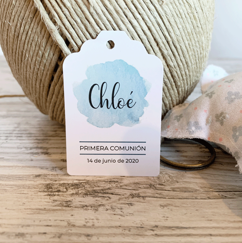 Todos los llaveros se entregan dentro de una bolsita de celofán y con una etiqueta de forma circular o en forma de etiqueta de 5cm con el diseño de la acuarela en color azul, verde o rosa.