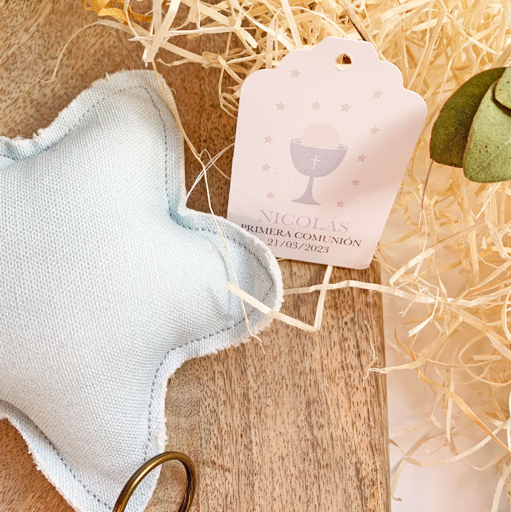 los llaveros pueden ir también con el nombre de cada invitado impreso sobre la tela o bien con el nombre del niño o niña que celebra la Primera Comunión.