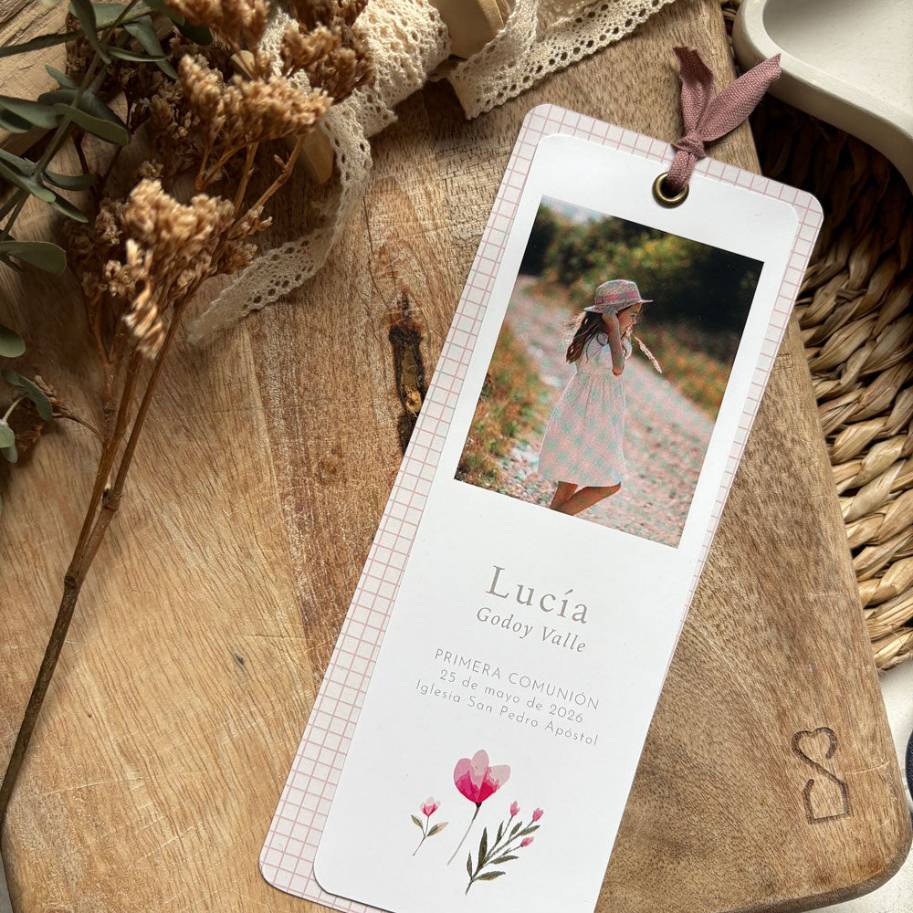 Personalizados con la foto del niño/niña y en el caso del punto de libro doble con el estampado que elijas para la cartulina trasera.